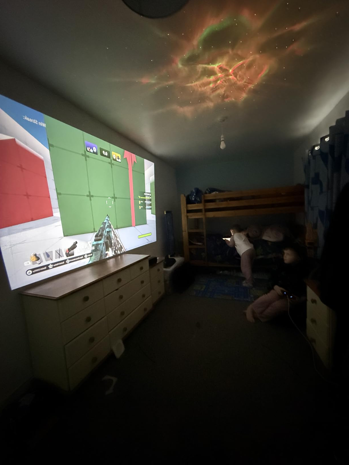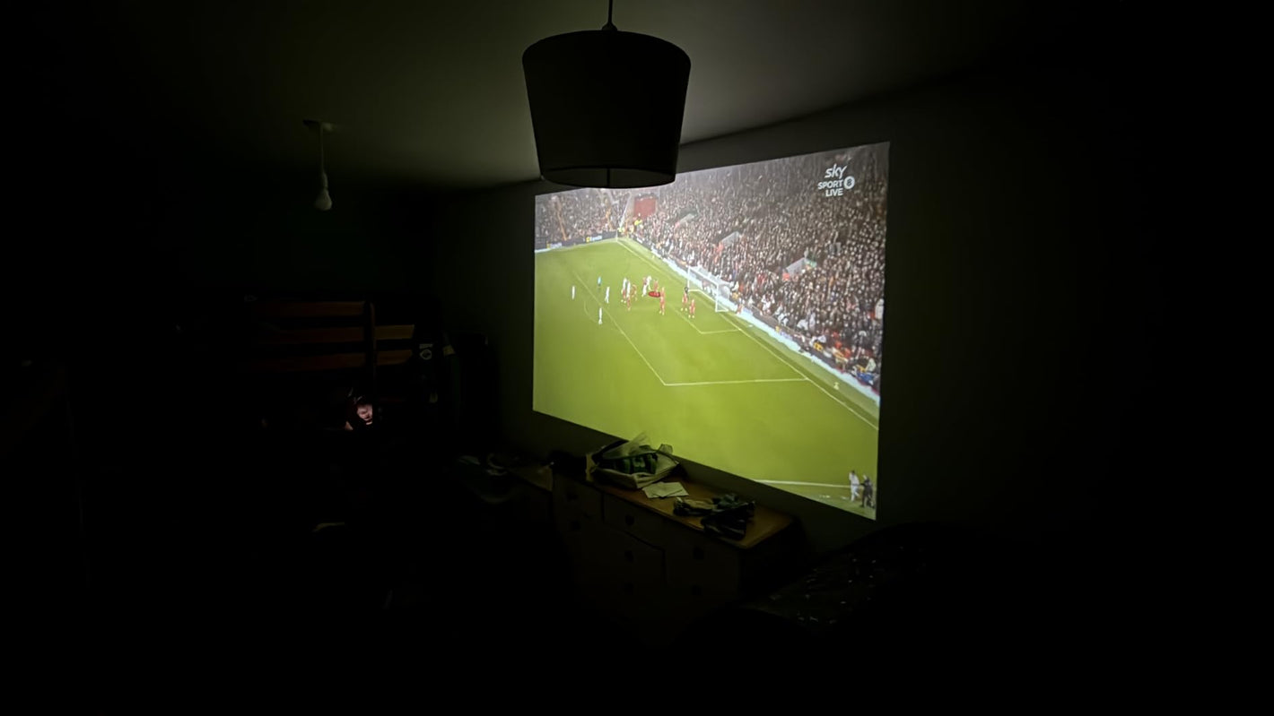 The CrowdCast projector can display up to 84 inches on any flat wall or surface. For the best picture quality we recommend a distance of 2-4 metres from the wall.